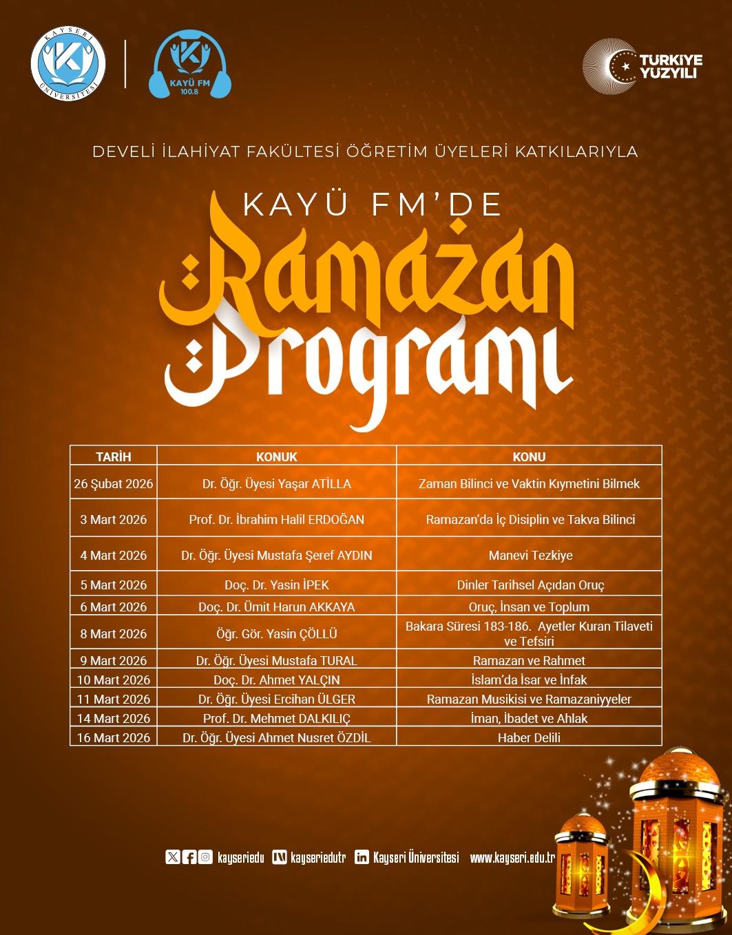 Ramazan ayı boyunca gerçekleştirilen programlar, Kayseri Üniversitesi Kayü FM üzerinden dinleyicilere ulaştı. Fakültemiz öğretim elemanlarının katkılarıyla hazırlanan programlarda Ramazan ayının manevi iklimi farklı yönleriyle ele alındı.